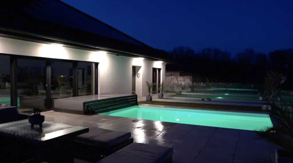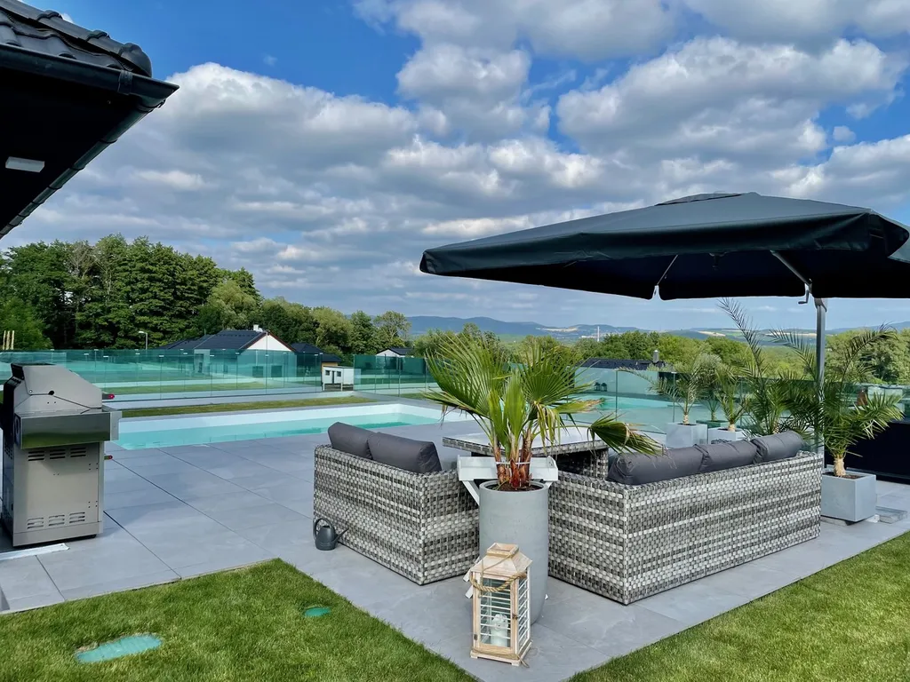 Dům je architektonicky citlivě zasazen do terénu a byl postaven s důrazem na kvalitní materiály, soukromí a dlouhodobě úsporný provoz. Dominantou nemovitosti je velkorysá terasa s bazénem a otevřeným výhledem do okolní přírody.