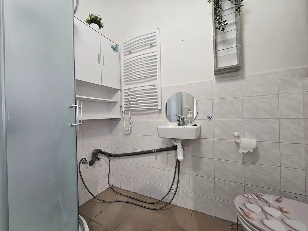 Byt situovaný v 1.np. má celkovou užitnou plochu 32m2 (plus sklepní kóje). V bytě kuchyňská linka s lednicí, stůl a dvě židle a skřín při vstupu do bytu. Koupelna je se sprchovým koutem, přípravou pro pračku, společná s toaletou. Útulný byt je ideální pro 1 max. 2 osoby. Byt je komplětně na elektřinu vč. topení a el. boileru.
