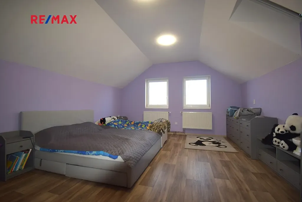 V podkroví jsou dvě ložnice, které jsou dodělány a využívány. Do budoucna se zvažovalo další využití podkroví. Z tohoto důvodu je předpřipravena další část, tedy koupelna se sprchovým koutem a přípravou na WC a k vlastnímu bydlení je zde místnost cca 40m2 s přípravou na kuchyňský kout. Po drobné úpravě je možné vše upravit jako samostatnou bytovou jednotku.