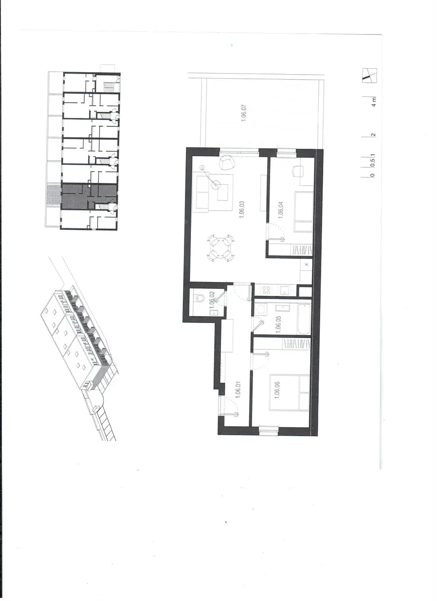 Dispozice bytu: obývací pokoj s KK (28 m2) s výstupem na terasu, ložnice (13 m2), dětský pokoj (11 m) s výstupem na terasu, koupelna s vanou (5 m2) s přípojkami na pračku, samostatné WC, propojující chodba, sklep a parkovací místo pro 1 OA. Dva pokoje mají samostatné vstupy, jsou neprůchozí. Terasa se zahrádkou (20 m2) je orientována na východ s dopoledním slunkem.