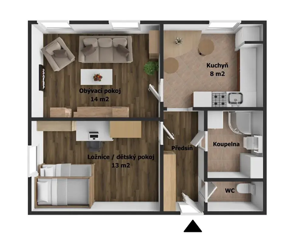 Byt má celkovou plochu 46,3 m2, obývací pokoj je velký 14 m2, navazující na kuchyni o velikosti 8 m2, ložnice/dětský pokoj je velký 13 m2. Ostatní plochu tvoří předsíň s vestavěnou šatní skříní, koupelna a WC.
