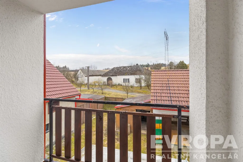 V patře pak tři ložnice a balkon, ideální pro klidné večery s výhledem do okolní krajiny.