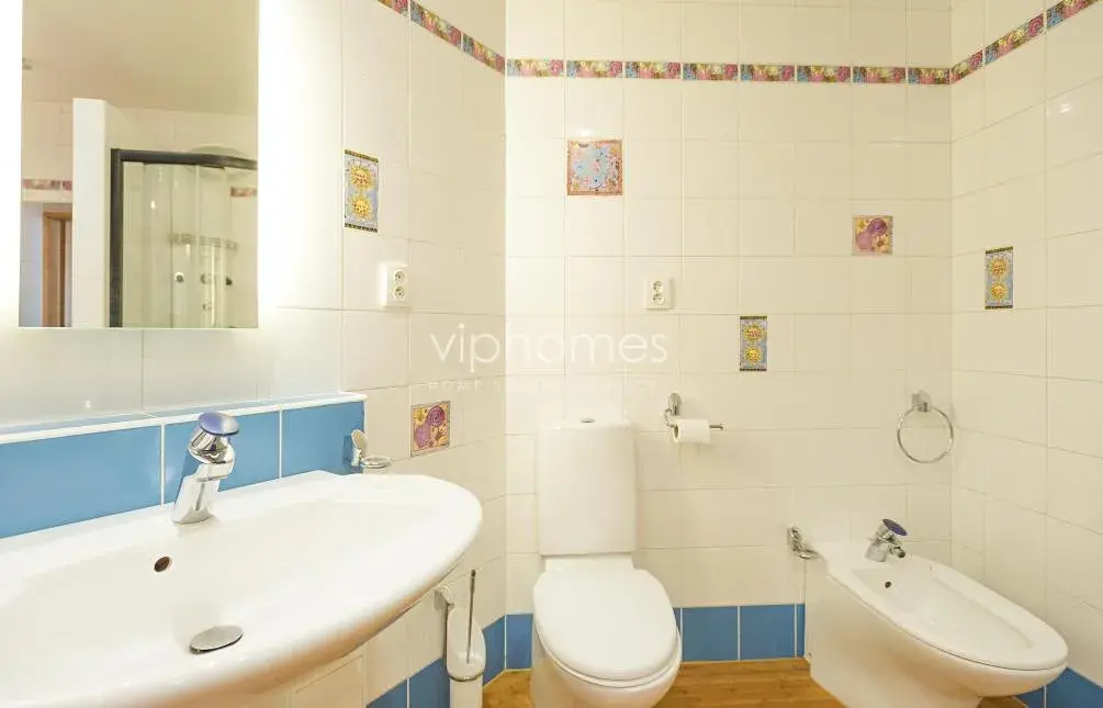 Dům nabízí celkem čtyři ložnice a dvě koupelny. V přízemí se nachází společenská část domu-obytný prostor s krbem, jídelnou a nová plně vybavená kuchyně, (spotřebiče Miele/myčka, digestoř, el. keram.deska, el. trouba, mikrovlnná trouba), a sociální zázemí. Z obývacího pokoje je vstup k bazénu a relaxačnímu zázemí ze saunou, sprchou, toaletou a pokojem, který je možno využít jako pracovnu nebo pokoj pro hosty. V patře je velká galerie, tři ložnice; hlavní ložnice má vlastní koupelnu /vana, WC, sprcha/, další dvě ložnice s koupelnou (sprcha/toaleta). Ze všech místností úžasné panoramatické výhledy.