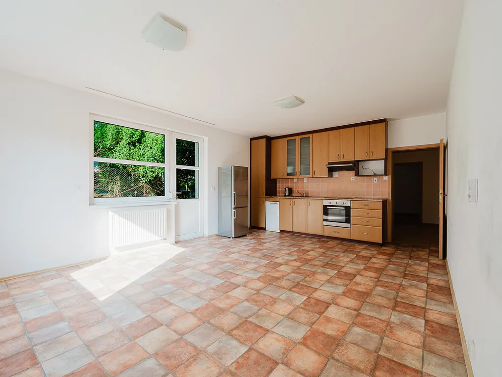 Bytová jednotka je dispozičně řešená jako 3+kk s výměrou 66m² a náleží k ní dále garáž s komorou o výměře 24m² a oplocený prostor předzahrádky s výměrou 370m², na kterou je vstup z obývacího pokoje.