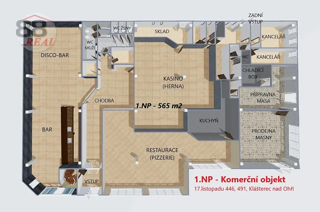 Komerční objekt s podl. plochou 683 m2 tvoří dvě řadové dvoupodlažní budovy s č.p. 446 a 491 se samostatnými bezbariérovými přístupy z ulice a pozemky o celkové ploše 1832 m2 (zastavěná plocha 682 m2). V přízemí hlavní budovy (480 m2) se nachází restaurace (pizzerie) s kapacitou 60 míst, bar s diskotékou s kapacitou 100 míst a herna (kasino). V patře (118 m2) s kapacitou 63 míst se nachází letní terasa restaurace v podobě historické lodi s dětským koutkem, salónky a WC. K dopravě potravin, apod. do patra slouží malý nákladní výtah umístěný v přípravně jídel. V přízemí druhé budovy je nyní nevyužitý prostor (85 m2), který byl nedávno využíván jako řeznictví. Ze zadní části mají obě budovy samostatný přístup na nakládací rampu a zpevněný pozemek , kde lze snadno vytvořit parkovací místa. Na pozemek objektu vjezdem s dálkově ovládanými vraty lze vjet i nákladním automobilem. Před objektem je pro hosty dostatečné množství parkovacích míst na veřejné komunikaci.