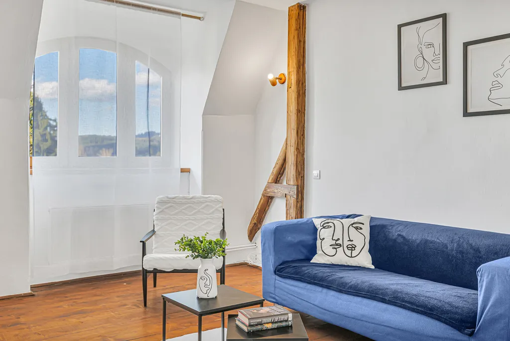 Byt zaujme především svou velkorysou dispozicí, světlem a příjemnou atmosférou. Najdete zde velké místnosti, dřevěné prvky, oblouky mezi místnostmi i přiznané trámy, které dávají prostoru charakter a odlišují ho od běžné nabídky.