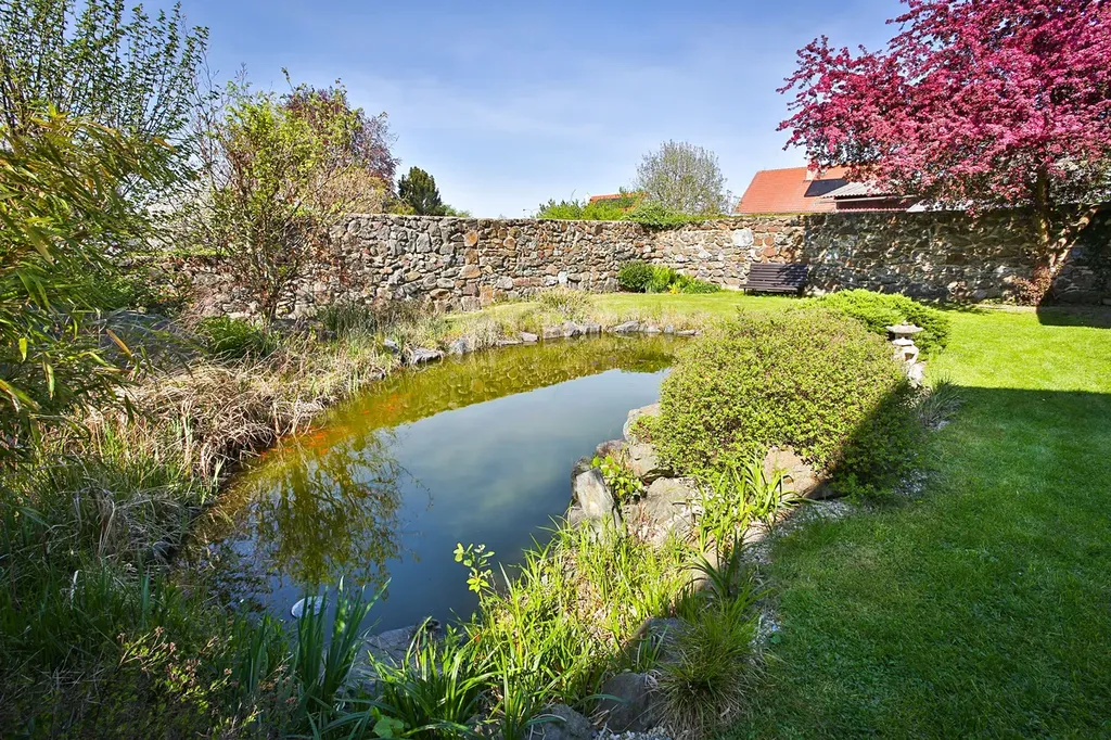 Vzrostlé stromy poskytují přirozený stín, zatímco zahradní jezírko dodává celému prostoru klidnou atmosféru.