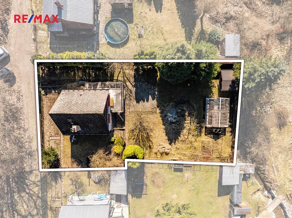 Chata stojí na pronajatém pozemku o výměře 661 m², na kterém se nachází také zahradní domek a skleník. Roční nájem 11 000 Kč.
