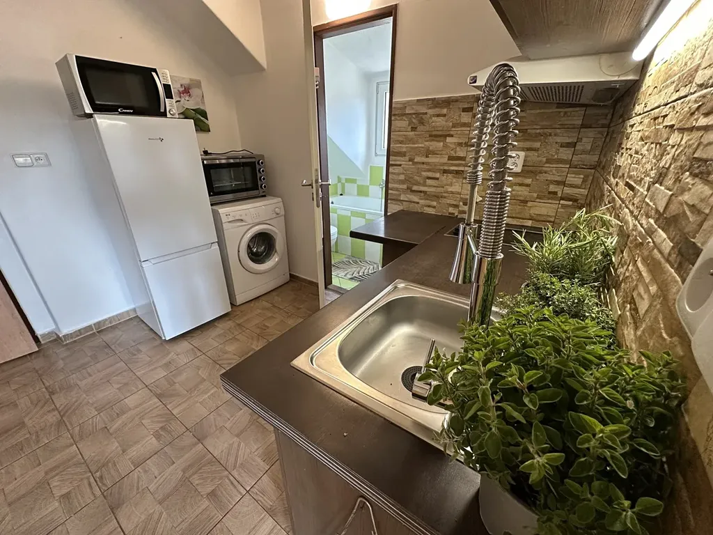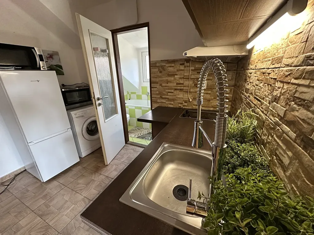 Byt se skládá z jedné obytné místnosti ( ložnice a obývací pokoj) a menší pokoj s kuchyňskou linkou, která je vybavena sklokeramickou varnou deskou, troubou, mikrovlnnou troubou a lednicí. Koupelna je spojena s toaletou, k dispozici je vana i pračka. Vytápění je řešeno elektrickým olejovým topením a v hlavní místnosti jsou navíc krbová kamna, která vytvářejí příjemnou atmosféru zejména v zimních měsících.