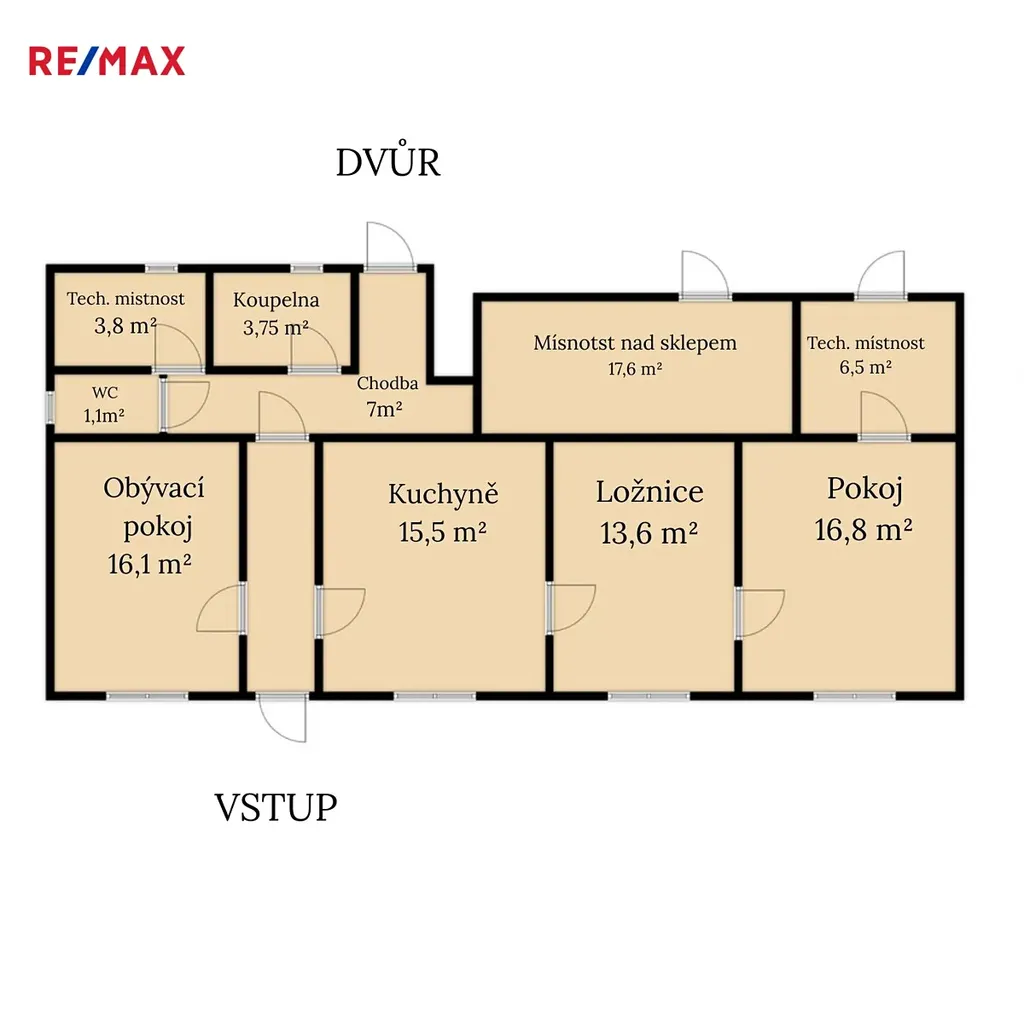 Dispozice domu zahrnuje tři obytné pokoje (16,1 m², 16,8 m² a 13,6 m²), kuchyni o velikosti 15,5 m², dále chodby, koupelnu (3,75 m²) a samostatné WC. Součástí domu je také sklep (13,4 m²) a další prostor nad sklepem o velikosti 17,6 m², který nabízí praktické využití například jako sklad.