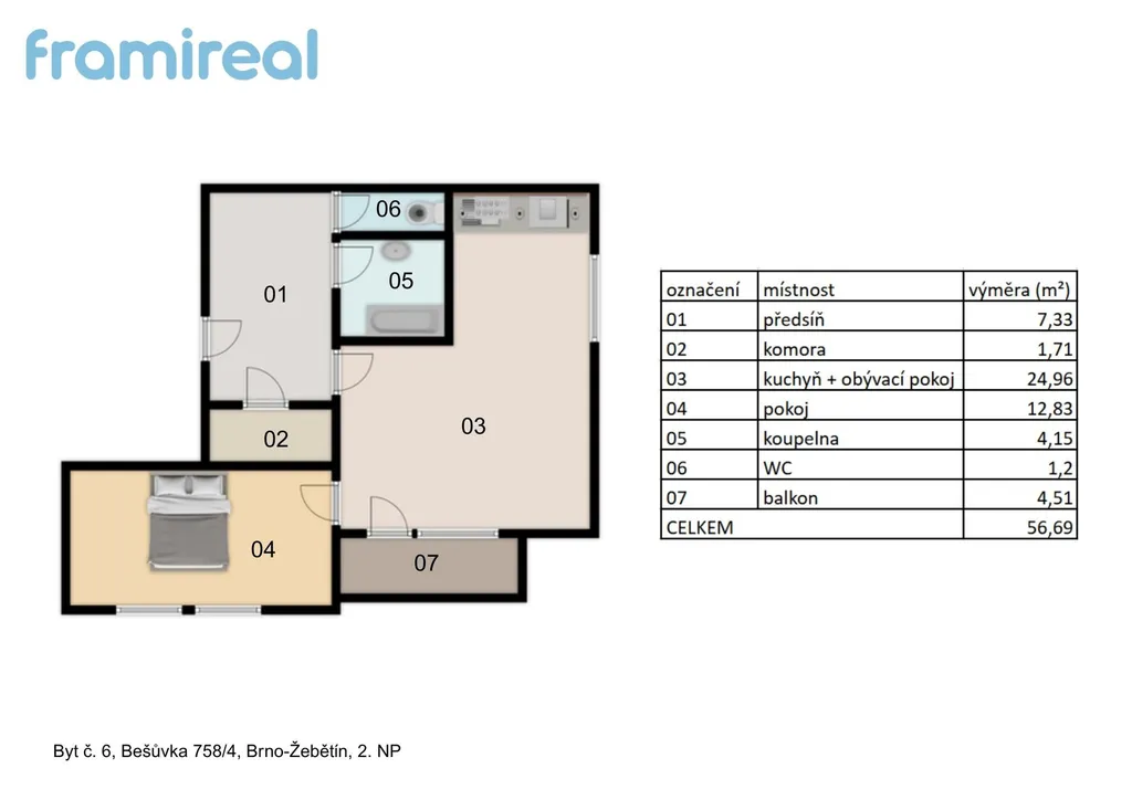 Byt je situovaný v klidné a vyhledávané lokalitě Brno-Žebětín, na ulici Bešůvka. Nachází se ve 2. nadzemním podlaží moderního bytového domu a díky nárožní orientaci na jih je krásně prosvětlený po celý den. K bytu náleží i parkovací stání přímo u domu v hodnotě 200 000 Kč, které je součástí prodeje – což je v této oblasti výrazná výhoda.