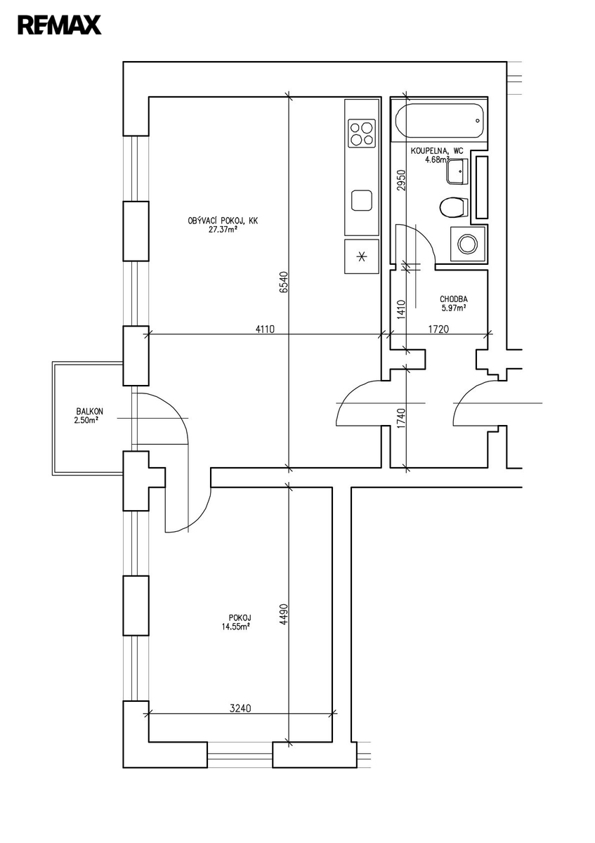 Dispozice bytu se skládá z předsíně (6 m2), v níž je prostor pro vestavěnou skříň, pokoje s kuchyňským koutem a výstupem na balkón (27,4 m2), samostatného neprůchozího pokoje (14,6 m2) a koupelny se sprchovým koutem (4,7 m2). Součástí nemovitosti je také prostorná komora (6,5 m2).
