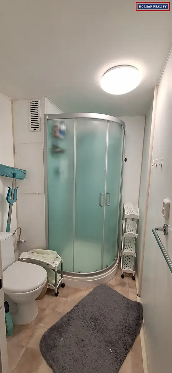 Na krátkou předsíň navazuje koupelna s toaletou, kuchyň s elektrickým sporákem a lednicí, s výměrou 8m2 a obývací pokoj se sedačkou, stolkem, šatní skříní a komodou, o velikosti 16m2. V rohu je pak pracovní stůl s kancelářskou židlí. Z obývacího pokoje je vstup na balkon.