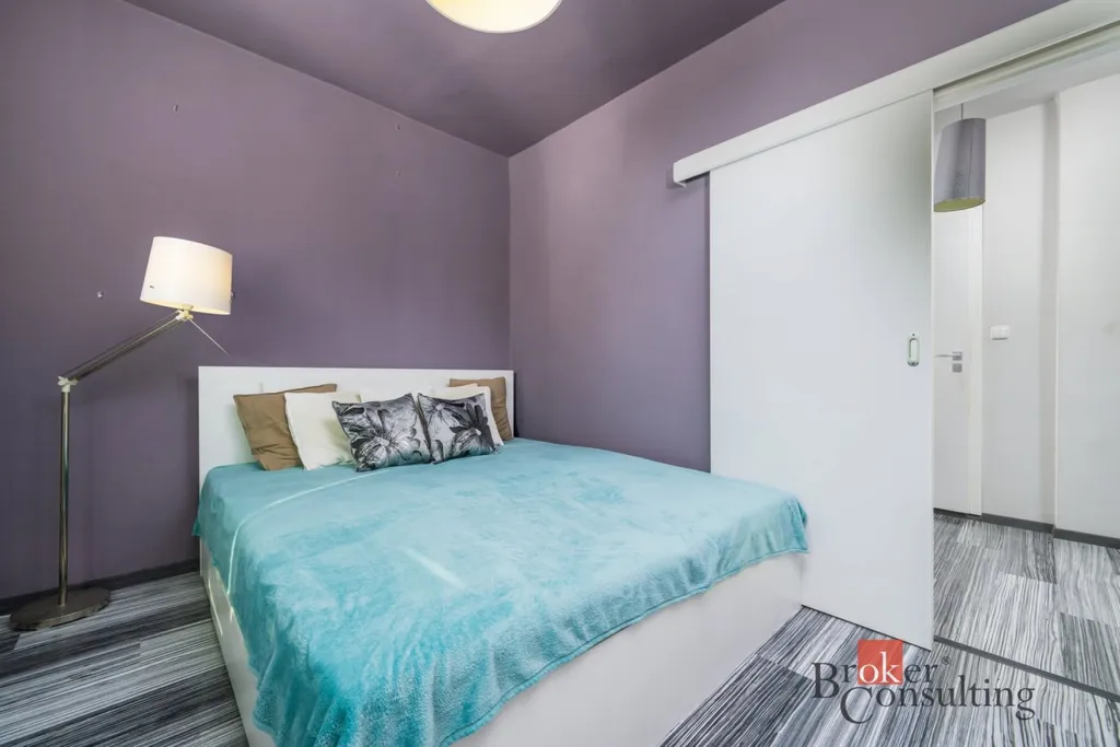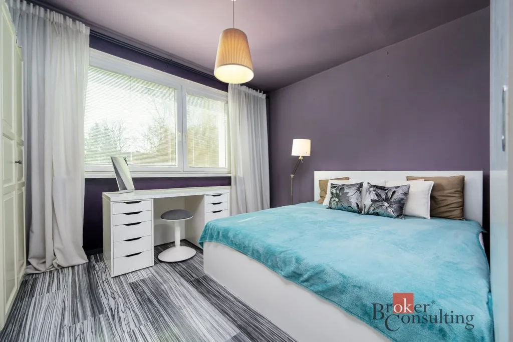 Z obývacího pokoje vstupujeme do ložnice s výhledem do zeleně. V bytě je oddělená toaleta od koupelny.