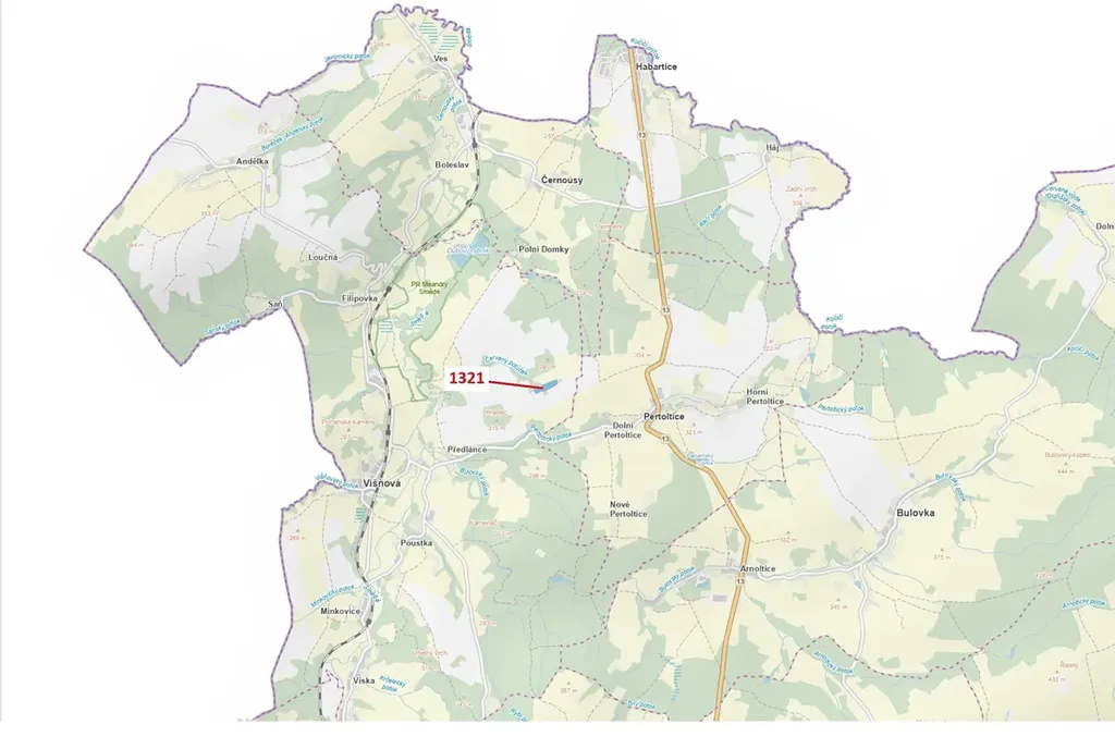 Lesní pozemek o výměře 21 506 m2, parcelní číslo 1321, podíl 1/1, katastrální území Předlánce, obec Višňová, obec s rozšířenou působností Frýdlant, okres Liberec, Liberecký kraj. Po těžbě.