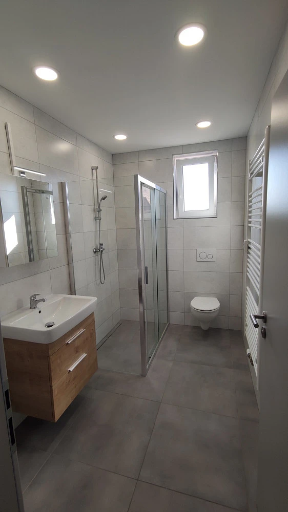 Vstupní protipožární dveře a ocelová zárubeň s jednobodovým bezpečnostním kováním. Okna pokoje + KK a ložnice jsou situována na západní stranu.