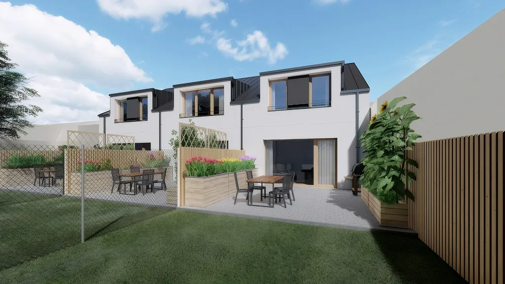 Řadový rodinný dům je dispozičně řešený jako 4+kk s možností změny na 5+kk, zahradou a dvěma parkovacími místy u domu.