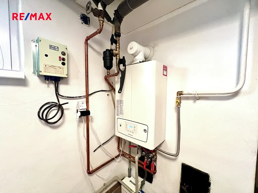 Vytápění domu je ústřední plynovým kotlem, voda se ohřívá v bojleru napojeném na solární panely.