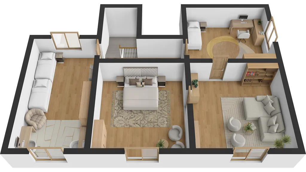 Ze vstupní chodby se dostaneme do obou bytových jednotek. V přízemí domu se nachází bytová jednotka 3+1 s koupelnou a toaletou. Pokoje se dají využít jako obývací pokoj, ložnice a jídelna.