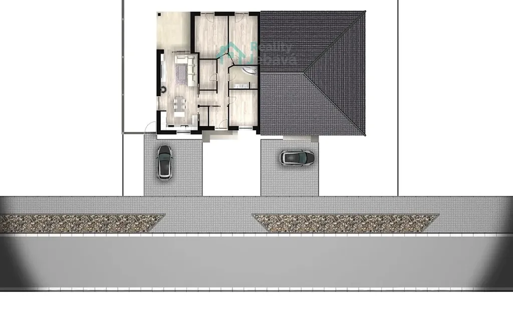 Projekt nabízí promyšlené dispoziční řešení s prostorným obývacím pokojem propojeným s kuchyňským koutem, ložnicí, dvěma dalšími pokoji, koupelnou a technickou místností. Velkým bonusem je krytá terasa přístupná přes posuvné dveře, která propojuje interiér se zahradou a vytváří příjemné místo pro rodinné posezení. Po dohodě je možné rozšířit dispozici na 6+kk a využít podkroví, takže si dům můžete přizpůsobit přesně podle svých představ.