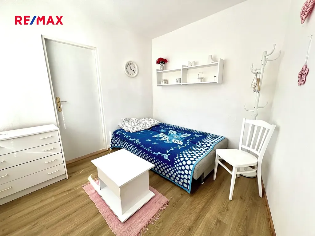 Dispozice je průchozí: větší vstupní místnost, vpravo obývák a navazující ložnice, vlevo nová kuchyně a navazující jídelna, koupelna se sprchovým koutem a toaletou, malý pokojík.