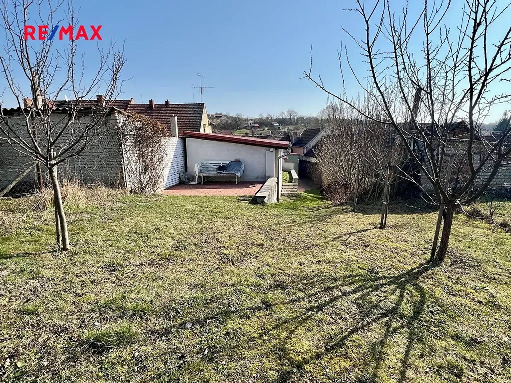 Za domem je malý uzavřený dvorek, zděná kůlna/dílna a mírně svažitá zahrada s ovocnými stromy a keři.