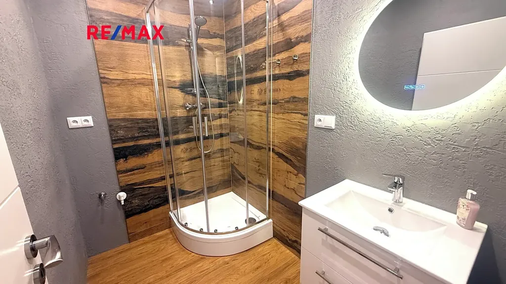 Koupelna se sprchovým koutem, přípojka na pračku.