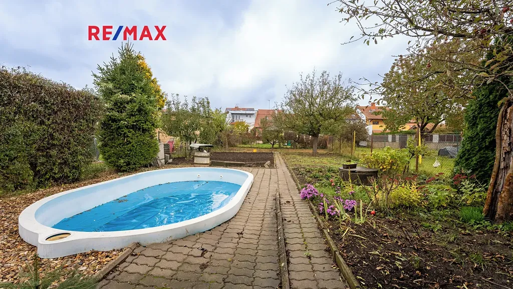 Za domem je uzavřený dvorek s pergolou, ze kterého, přes obecní cestu, vyjdeme na zahradu, kde je umístěna garáž, zastřešené posezení, bazén a užitková zahrada.