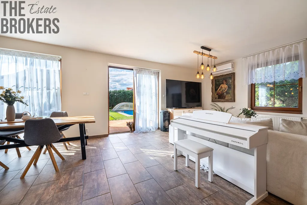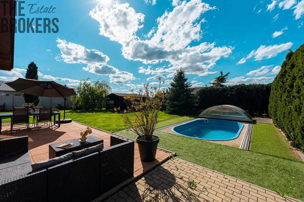 - Bazén a zahrada: Na udržované a pečlivě osázené zahradě najdete zapuštěný bazén o rozloze 15 m² s filtrací na bázi soli – ideální pro osvěžení v horkých letních dnech. Pro vaše pohodlí je zde také zahradní domek a terasa, na kterou vstoupíte přímo z obývacího pokoje.