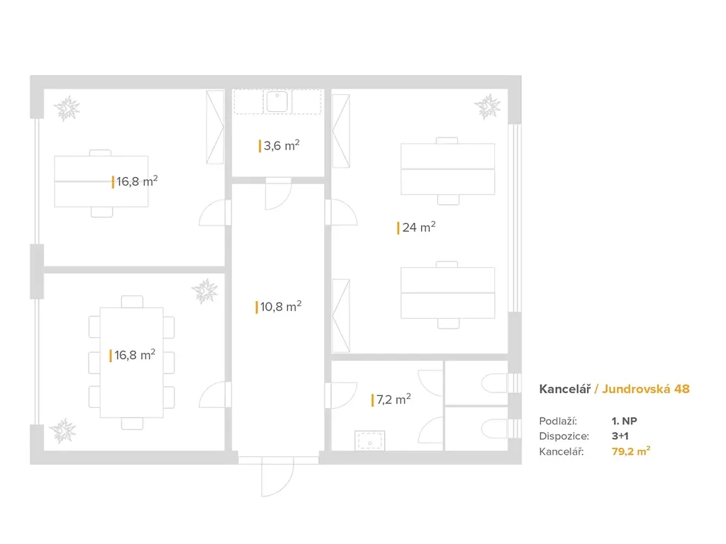 Prostory tvoří dvě samostatné kanceláře s dostatkem denního světla a úložných kapacit. K dispozici je dále zasedací místnost a kuchyňka (částečně sdílené) a samostatné WC. Dispozice je praktická a umožňuje oddělení pracovních zón i komfortní zázemí pro jednání s klienty.