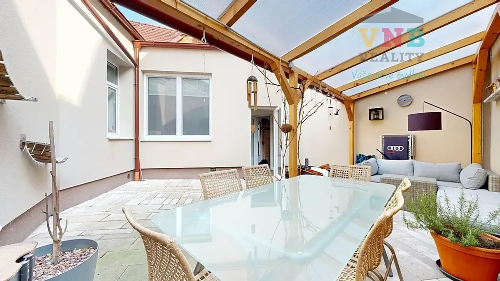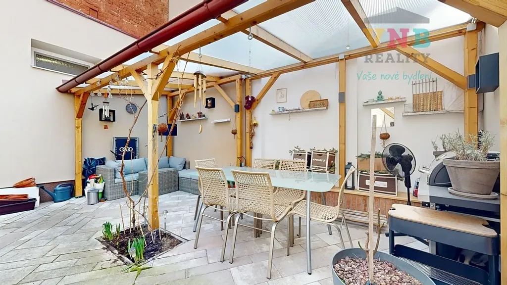 Z chodby je přístup do uzavřeného atria s pergolou, které poskytuje klidné místo pro relaxaci i posezení s dostatkem soukromí. Dále je k dispozici sklep a prostorná půda s dalším potenciálem využití.