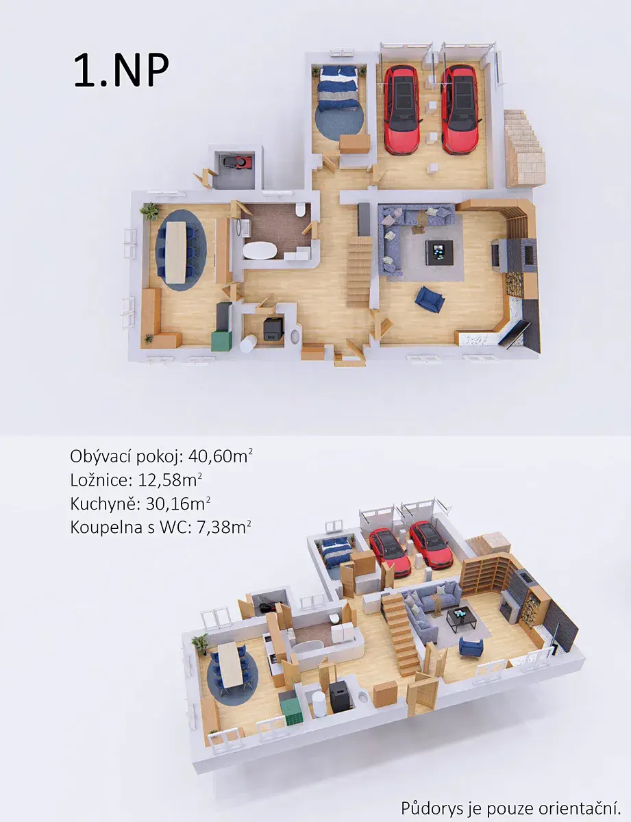 • Přízemí: obytné prostory v původním stylu, krb, kachlová kamna, kuchyně, sociální zázemí
