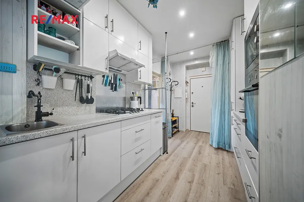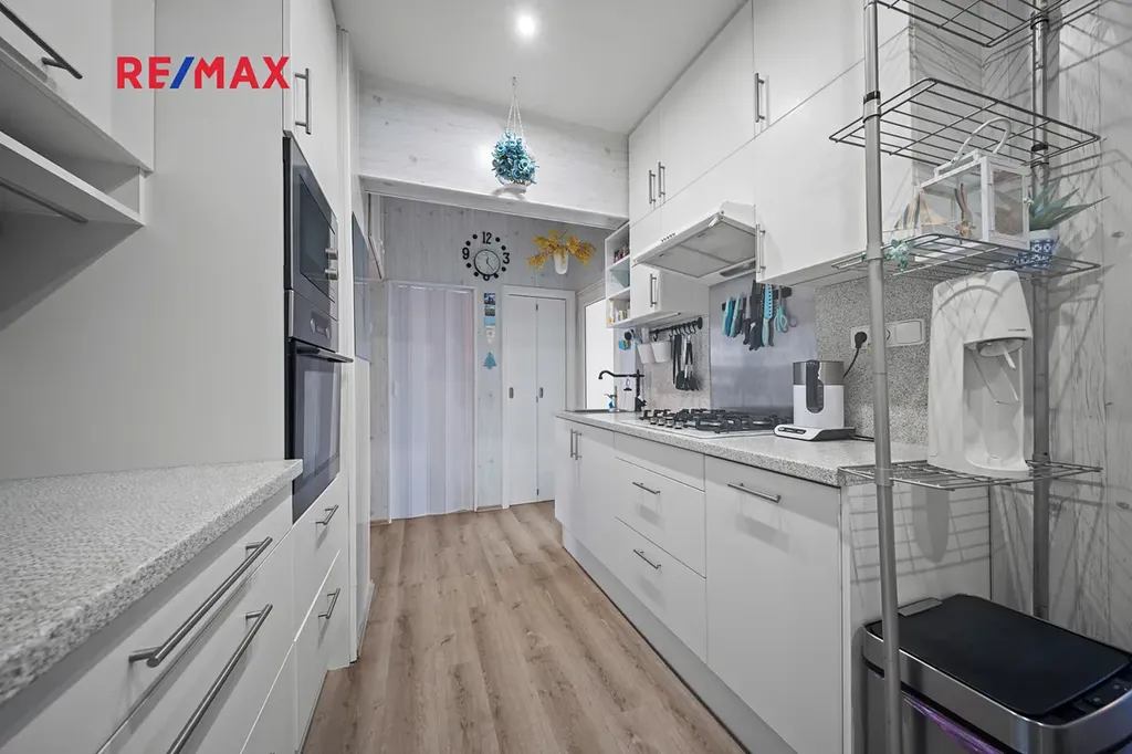 V prostorné vstupní chodbě (14,5m2) byla vybudována kuchyně, byt má tedy nyní další 2 ložnice a obývací pokoj.