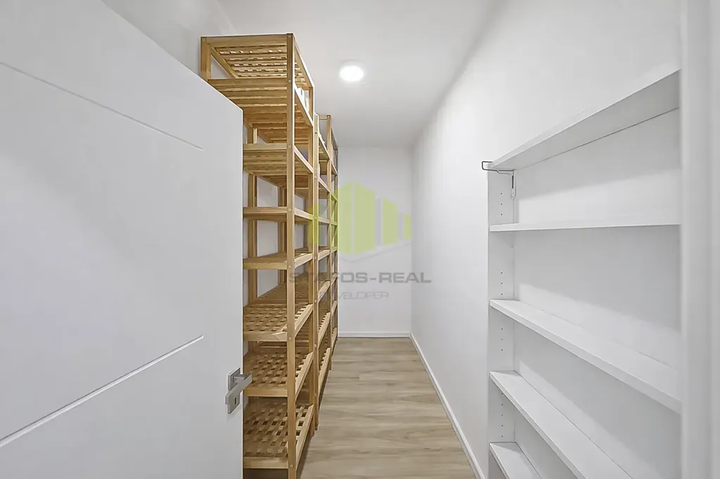 Dispozičně je byt velmi promyšleně řešen a nabízí prostorný obývací pokoj s kuchyňským koutem a přímým vstupem na lodžii, dále samostatnou ložnici, dětský pokoj, koupelnu se sprchovým koutem, samostatné WC a vstupní chodbu. Velkým benefitem je samostatná walk-in šatna umístěná naproti ložnici, která slouží výhradně pro uložení oblečení a věcí a nabízí nadstandardní množství úložného prostoru. Komfort bydlení dále zvyšuje i privátní mezichodba sdílená pouze se sousedním bytem.