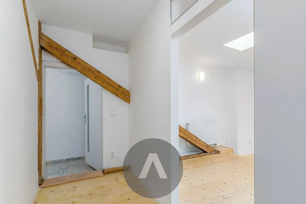 Podkrovní nezařízený byt o celkové ploše cca 90 m2 s balkonem se nachází ve 4. patře bytového domu bez výtahu.
