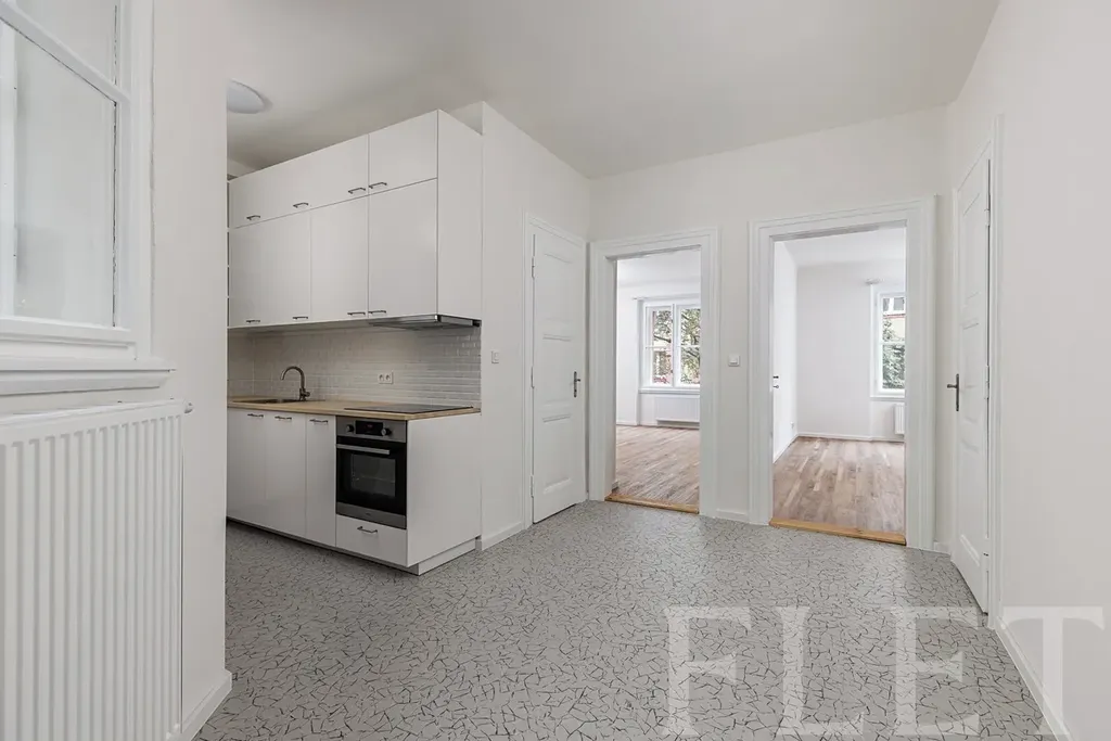 Centrální hala: Po vstupu vás přivítá prostorná hala, která slouží jako srdce bytu. Je zde umístěn plně vybavený kuchyňský kout (trouba, varná deska, myčka, lednice).