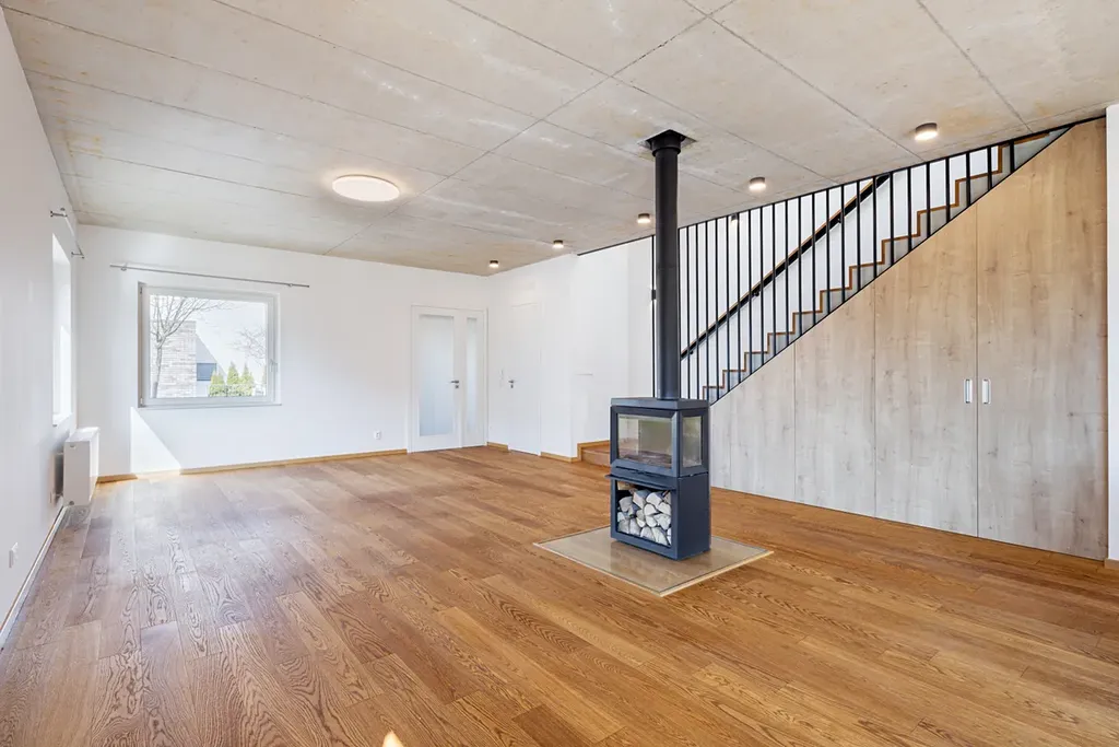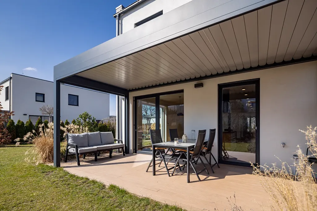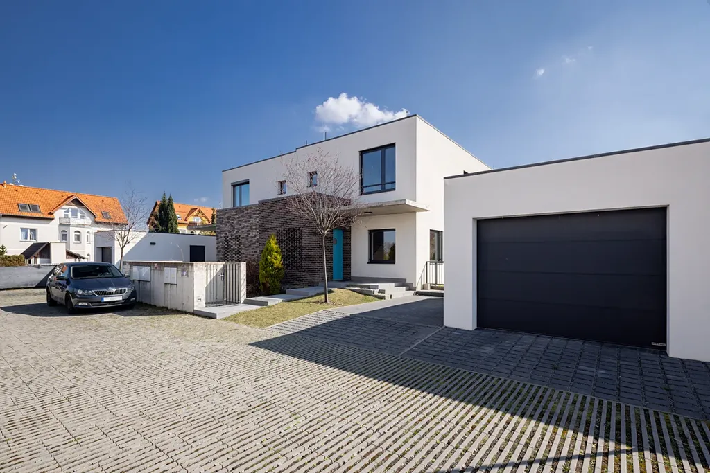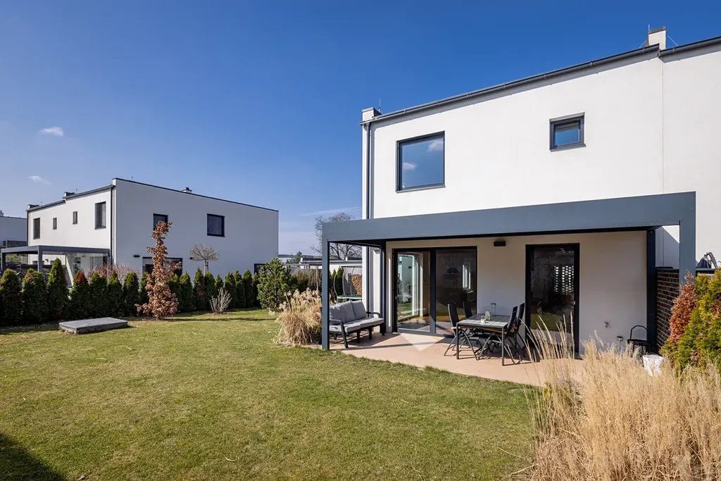 Součástí domu je terasa se zahradou, garáž pro jedno auto a další parkovací stání přímo před domem. Nemovitost je provedena ve vysokém standardu a prodává se částečně zařízená – k dispozici je kuchyňská linka, exteriérové hliníkové žaluzie, krbová kamna v obývacím pokoji, vestavěné skříně na míru a bioklimatická pergola na terase. Dům je tak připraven k okamžitému bydlení bez nutnosti dalších investic.