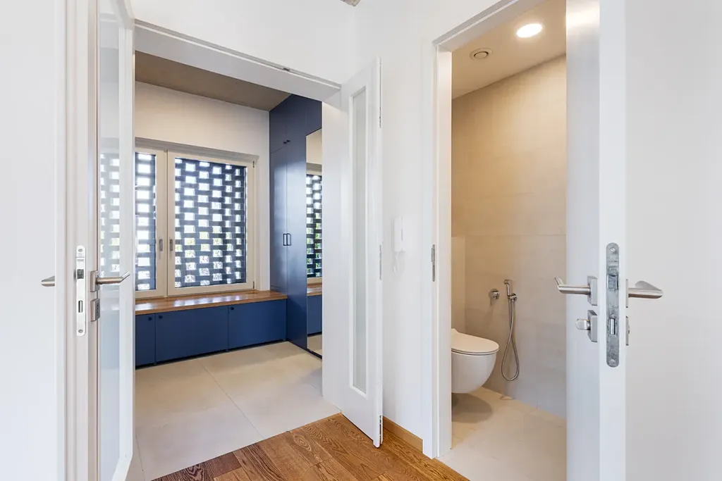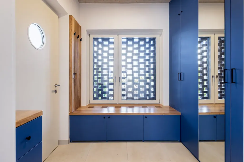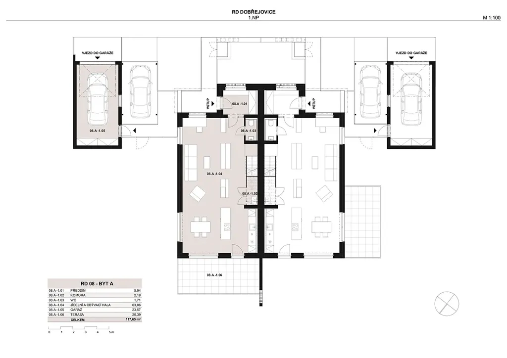 Dispozice domu je velmi prakticky řešena. V přízemí se nachází vstupní zádveří s vestavěnou skříní, samostatné WC a prostorný obývací pokoj propojený s kuchyní a jídelní částí. Z obývacího prostoru je přímý vstup na terasu a zahradu. Pod schodištěm je umístěna technická místnost. V prvním patře se nachází tři ložnice a dvě koupelny, což nabízí komfortní zázemí i pro větší rodinu.