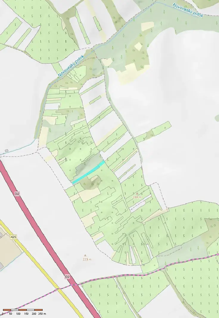 • Ve spodní části na parcele č. 7472 o velikosti 496 m2 je švestkový sad, parcela je rovinatá, oplocena ze 3 stran, je na ní umístněná železná cisterna, užívaná jako nádrž na vodu, závlaha vede po celém pozemku až na parcelu č. 7474 v horní části. Jde rozšířený způsob zavlažování v této oblasti. Parcela má šíři 12m.