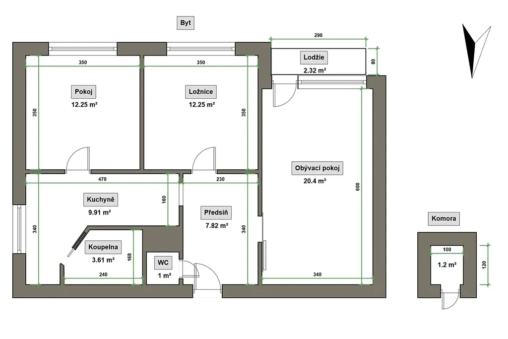 • celková plocha bytu cca 69 m² + ( plocha lodžie 2,5m², plocha