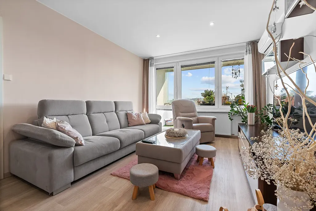 Ráda bych Vás provedla a představila Vám ke koupi moderní a slunný byt 3+1 po rekonstrukci s jednou zasklenou lodžií ve vyhledávané, a přitom klidné lokalitě Otrokovic – Trávníky, ul. SNP.