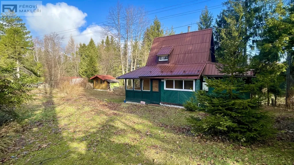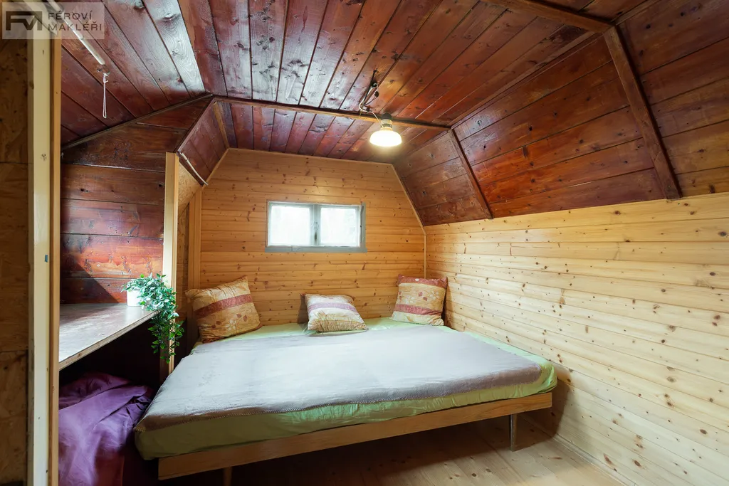 Chata o užitné ploše cca 60m2 se nachází na krásném pozemku o velikosti 1043m2 a nabízí dostatek prostoru i soukromí. Vstup do chaty se skládá z příjemné verandy s výhledem do okolní přirody a vytváří hezký prostor pro relaxaci za každého počasí. V přízemí chaty je chodba, menší obývací pokoj s krbovými kamny, úložný prostor, kuchyňka s jídelním stolem, sprcha a wc. V prvním patře se nachází ložnice a další úložný prostor.