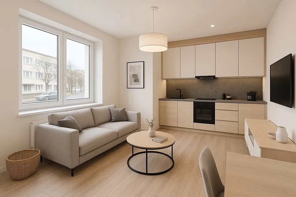 Dispozici tvoří obývací pokoj s kuchyňským koutem a jídelní částí, samostatná ložnice a koupelna s WC. Jednotka je bezbariérová.