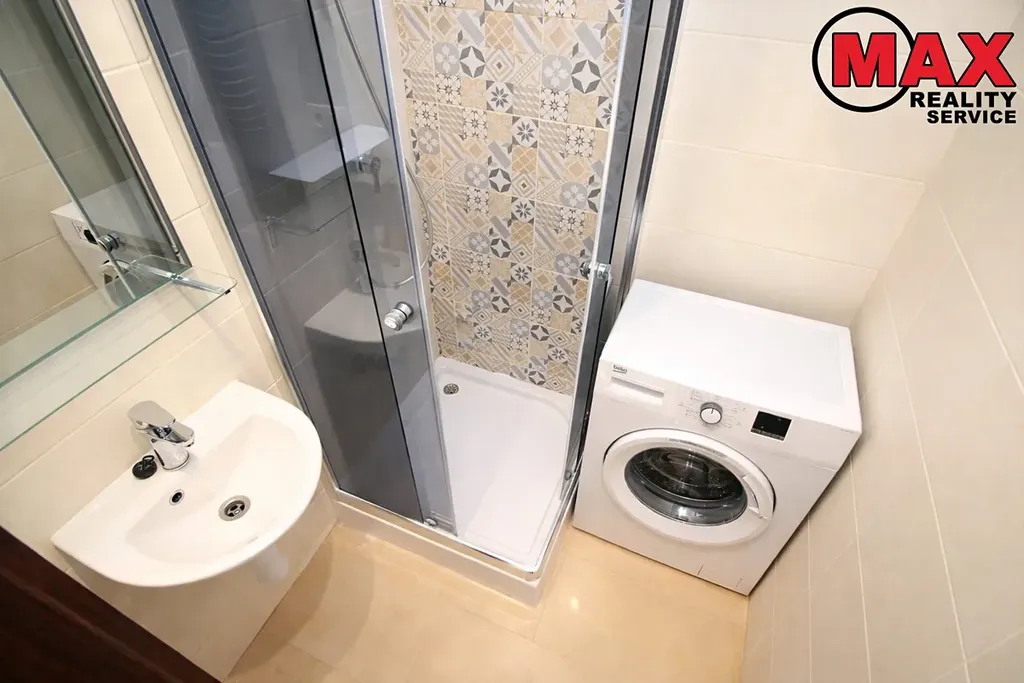 2.pokoj: 1x single postel vč. matrace a úložným prostorem, TV stolek, psací stůl, koupelna: sprchový kout, pračka, topení v koupelně. WC: toaleta geberit.