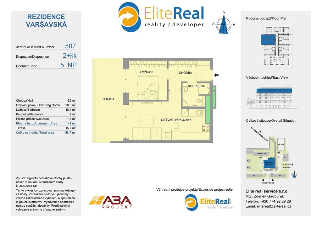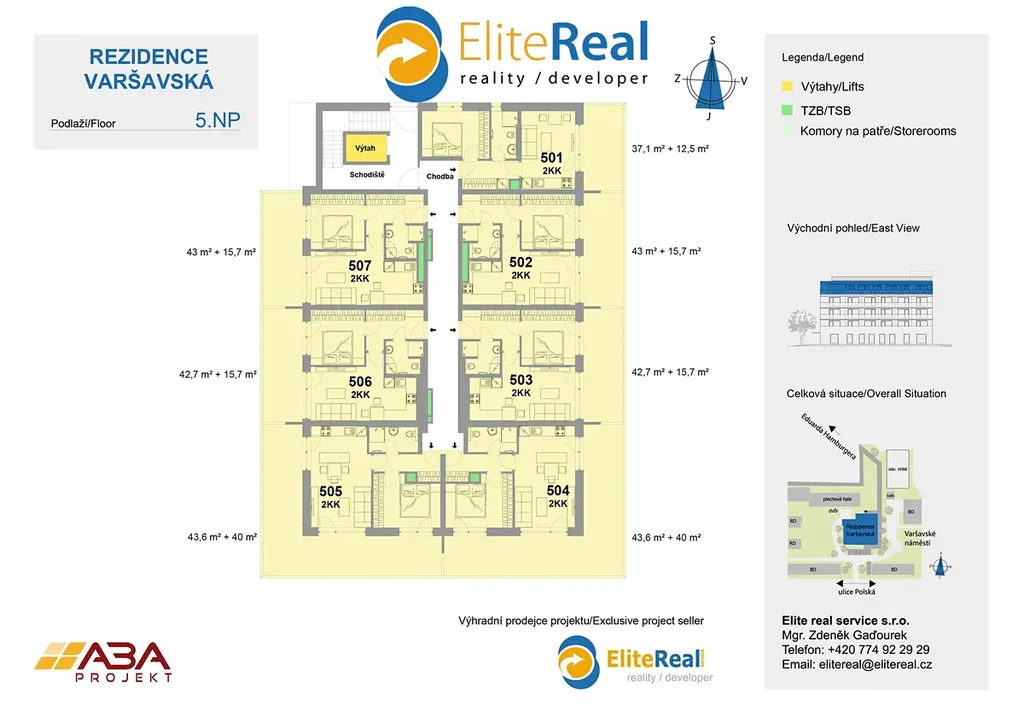 Bytová jednotka 2+kk 507 je situována v 5.NP, je orientována na západ. Plocha jednotky 43 m2 + plocha terasy 15,7 m2. Zajistíme Vám bezplatně financování nemovitosti. Nabízíme klientům služby vlastního hypotéčního centra s výhodami, které jsme pro Vás s bankovními ústavy připravily. Kupte si nové nízkonákladové bydlení - bytový dům je zařazen do energetické třídy B. Půdorys bytové jednotky, který zde prezentujeme, je základní. Dispozici nové jednotky a design si můžete upravit dle vlastních požadavků. Jednotky je možno slučovat i rozdělovat dle fáze výstavby. Nechte si postavit nový byt dle vašich představ. Standardní vybavení bytů splňuje požadavky vysokého standardu a moderního bydlení (vinylová podlaha, obložkové zárubně, moderní keramické obklady, francouzské okno, atd.).