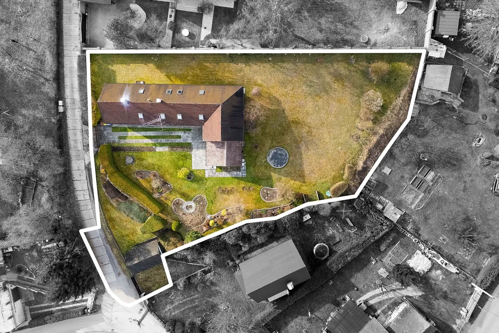Pozemek o velikosti 2 111 m² je velmi příjemný, vzdušný a po celý den slunný. Je rozdělen na okrasnou, udržovanou část a volnou travnatou plochu s dalším potenciálem využití.