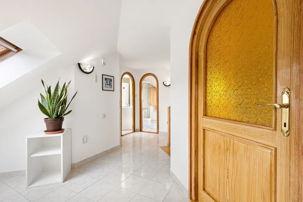 Podkroví dále nabízí dva samostatné pokoje, halu, koupelnu, šatnu a technickou místnost.