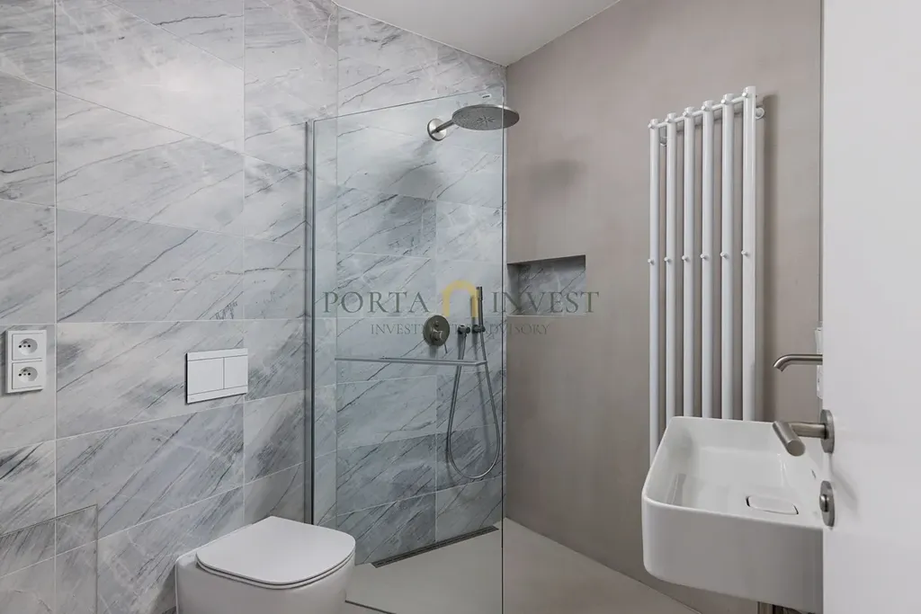 • luxusní koupelna se sprchovým koutem, kde je použit obklad z pravého mramoru