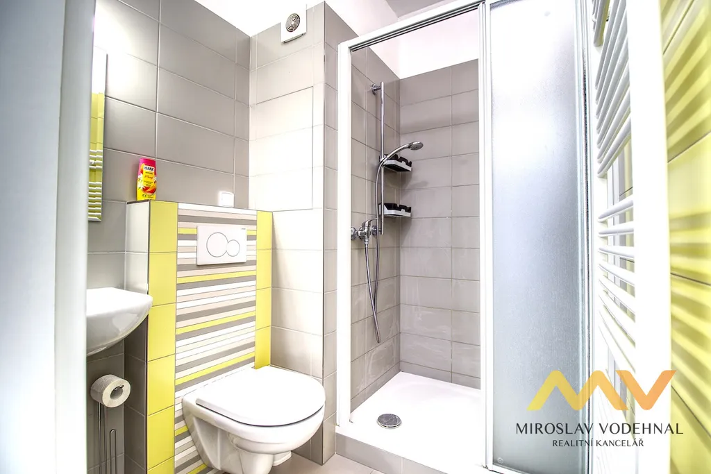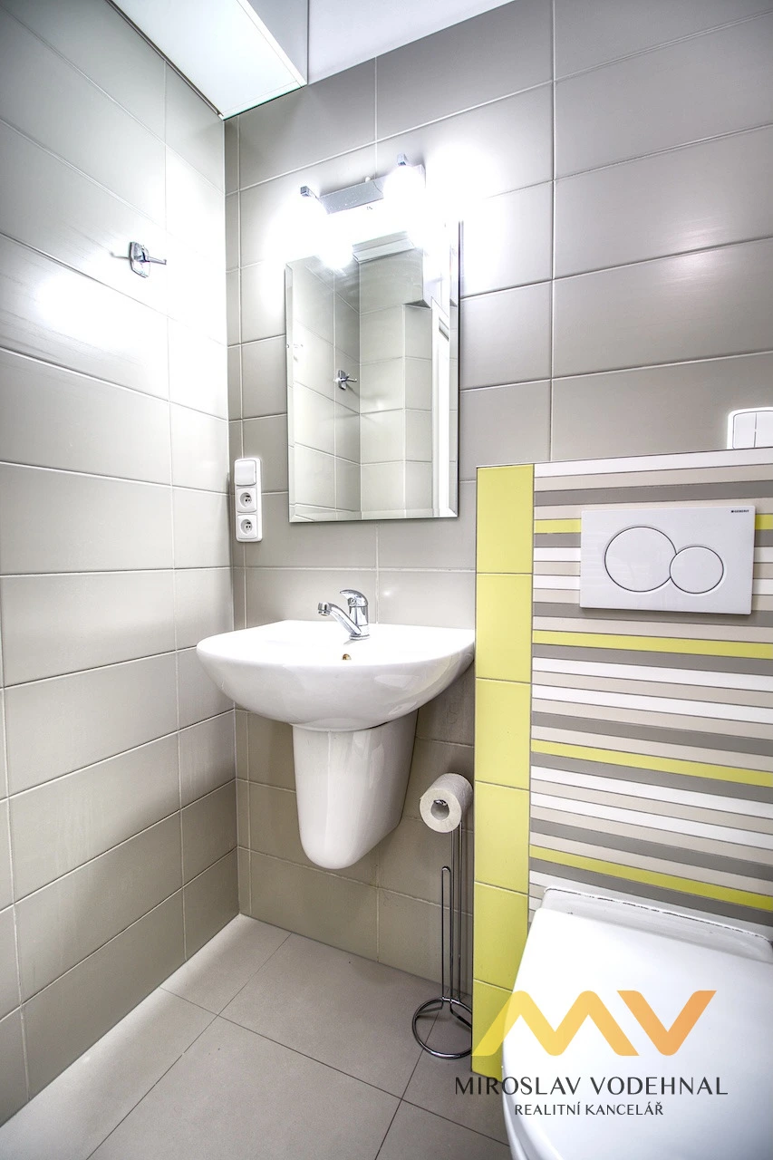 Koupelna je se sprchovým koutem, umyvadlem se zrcadlem a toaletou. Na předsíň navazuje otevřený prostor, který je ideální jako šatna, komora nebo úložný prostor. K bytu náleží sklepní kóje v suterénu domu a v mezipatře lodžie o velikosti 4 m² určena pouze pro tento byt.