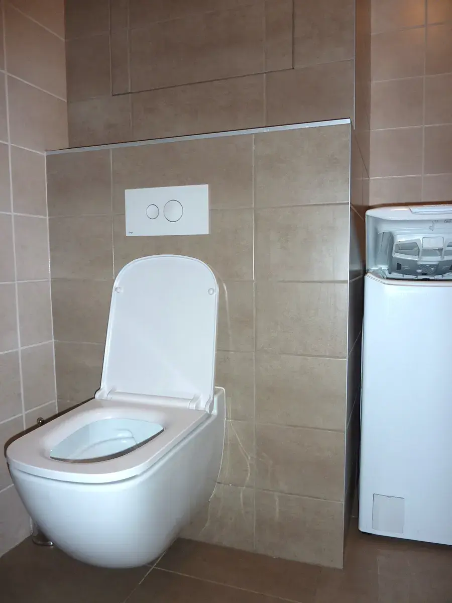 Koupelna se sprchovým koutem a pračkou.